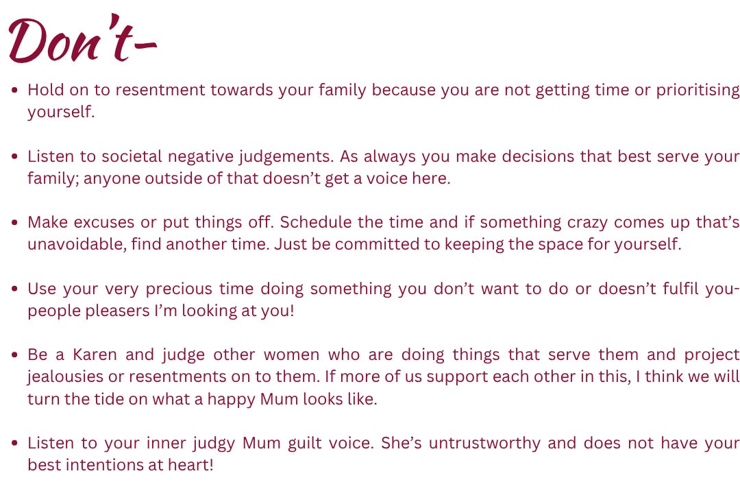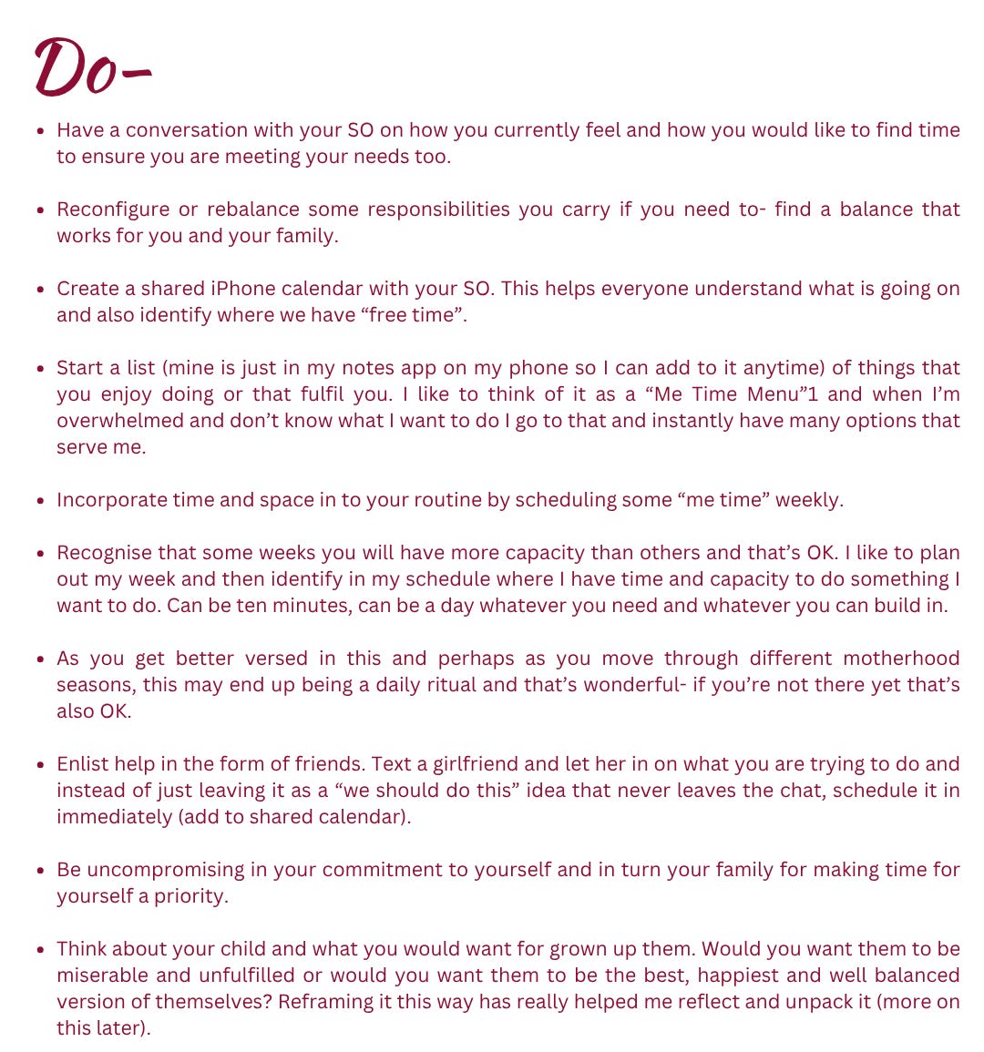 If you’re reading this and you’re already feeling triggered or thinking this is me, I don’t make time for myself and I do feel tired, resentful, angry, depleted etc but I can’t see how it can get better- I’m here to say it will I promise and I too have felt that. We just simply have to prioritise meeting our own needs and look at it as taking care of our families because at the end of the day we are a part of our families. Also newsflash people, just because we are now Mums doesn’t mean our needs, our interests and what we need to feel fulfilled simply evaporates. We are also just human beings walking through this life and experiencing things for the first time too- WE HAVE NEEDS.
